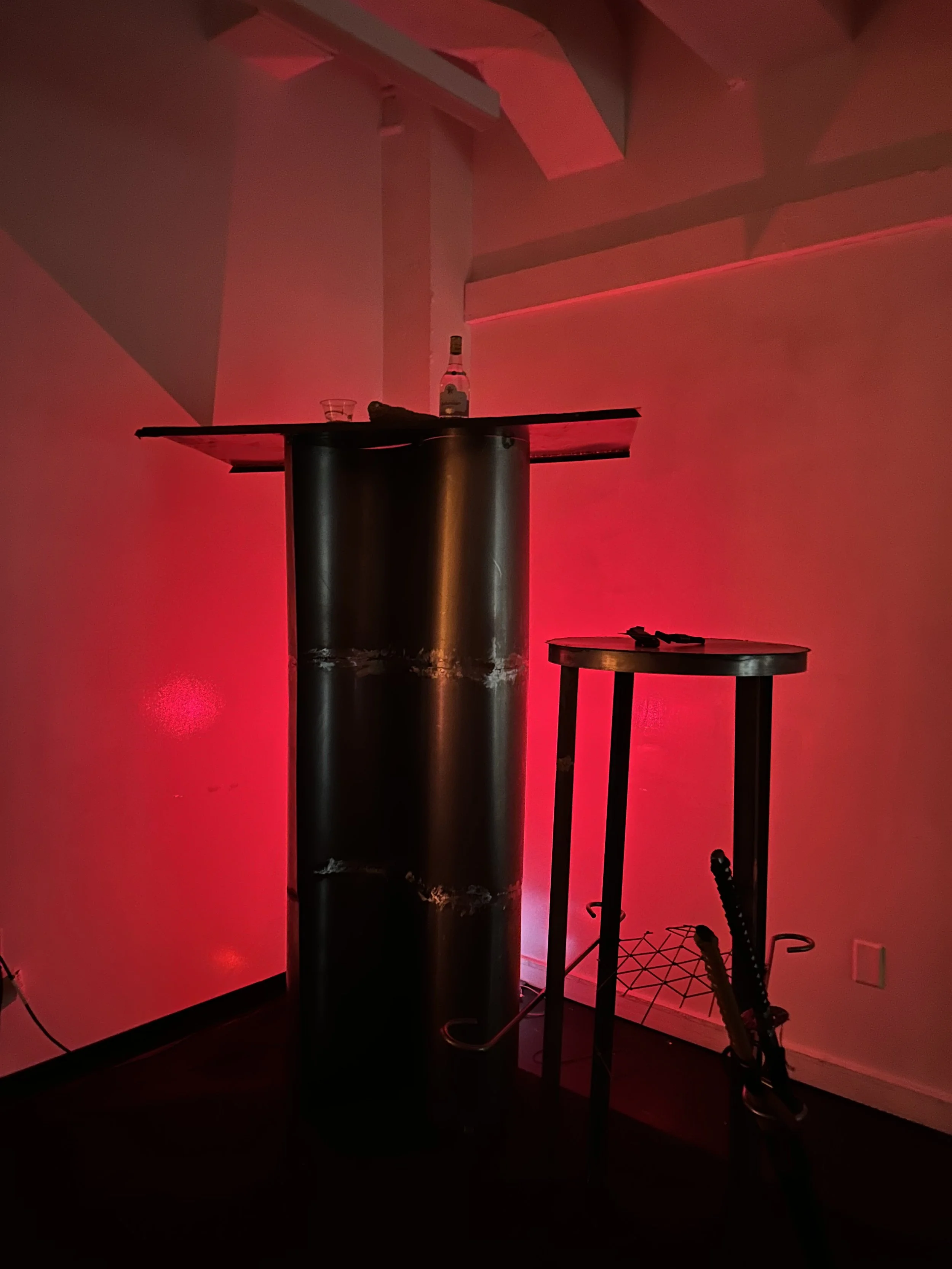 A multi sensorial sculptural installation in honor of a spirit including a 6ft table, 4ft stool, 2 swords, Smith and Wesson Knife, yam, palm oil, and Barbancourt Rum
